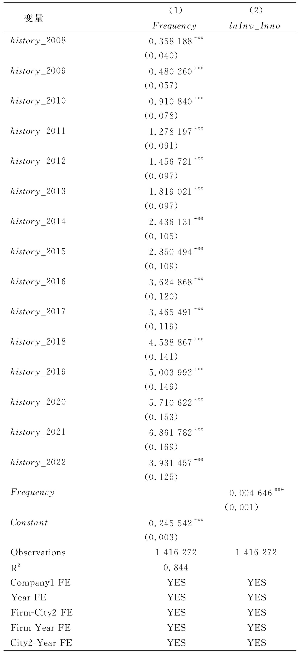 变量(1)(2)FrequencylnInv_Innohistory_20080.358 188***(0.040)history_20090.480 260***(0.057)history_20100.910 840***(0.078)history_20111.278 197***(0.091)history_20121.456 721***(0.097)history_20131.819 021***(0.097)history_20142.436 131***(0.105)history_20152.850 494***(0.109)history_20163.624 868***(0.120)history_20173.465 491***(0.119)history_20184.538 867***(0.141)history_20195.003 992***(0.149)history_20205.710 622***(0.153)history_20216.861 782***(0.169)history_20223.931 457***(0.125)Frequency0.004 646***(0.001)Constant0.245 542***(0.003)Observations1 416 2721 416 272R20.844Company1 FEYESYESYear FEYESYESFirm-City2 FEYESYESFirm-Year FEYESYESCity2-Year FEYESYES