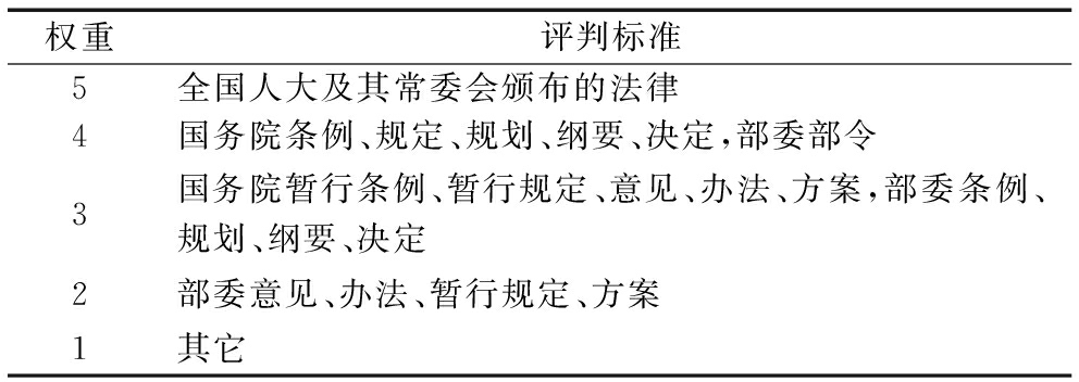 权重评判标准5全国人大及其常委会颁布的法律4国务院条例、规定、规划、纲要、决定,部委部令3国务院暂行条例、暂行规定、意见、办法、方案,部委条例、规划、纲要、决定2部委意见、办法、暂行规定、方案1其它