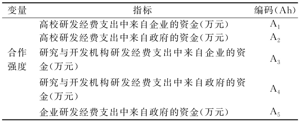 变量指标编码(Ah)高校研发经费支出中来自企业的资金(万元)A1高校研发经费支出中来自政府的资金(万元)A2合作强度研究与开发机构研发经费支出中来自企业的资金(万元)A3研究与开发机构研发经费支出中来自政府的资金(万元)A4企业研发经费支出中来自政府的资金(万元)A5