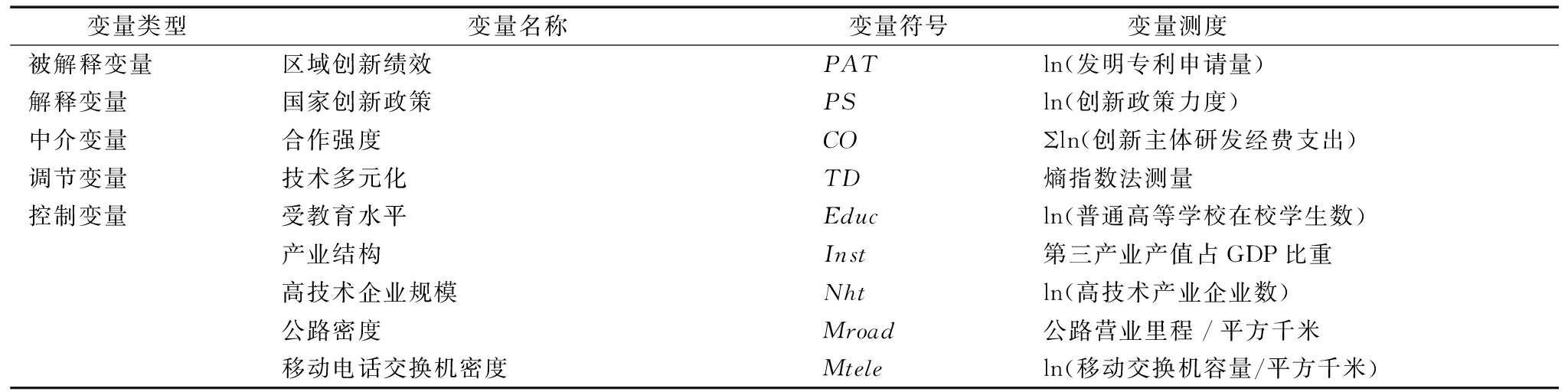变量类型变量名称变量符号变量测度被解释变量区域创新绩效PATln(发明专利申请量)解释变量国家创新政策PSln(创新政策力度)中介变量合作强度COΣln(创新主体研发经费支出)调节变量技术多元化TD熵指数法测量控制变量受教育水平Educln(普通高等学校在校学生数)产业结构Inst第三产业产值占GDP比重高技术企业规模Nhtln(高技术产业企业数)公路密度Mroad公路营业里程/平方千米移动电话交换机密度Mteleln(移动交换机容量/平方千米)