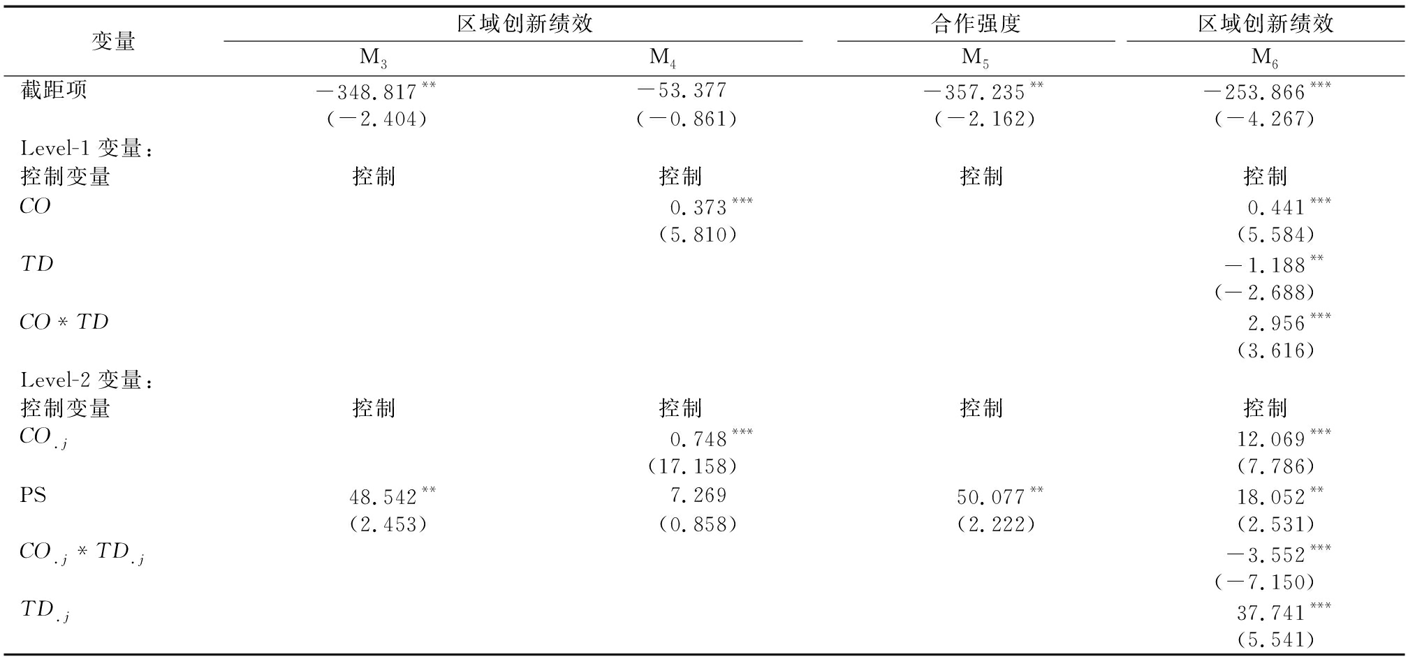 变量区域创新绩效M3M4合作强度M5区域创新绩效M6截距项-348.817**-53.377-357.235**-253.866***(-2.404)(-0.861)(-2.162)(-4.267)Level-1变量:控制变量控制控制控制控制CO0.373***0.441***(5.810)(5.584)TD-1.188**(-2.688)CO*TD2.956***(3.616)Level-2变量:控制变量控制控制控制控制CO.j0.748***12.069***(17.158)(7.786)PS48.542**7.26950.077**18.052**(2.453)(0.858)(2.222)(2.531)CO.j*TD.j-3.552***(-7.150)TD.j37.741***(5.541)