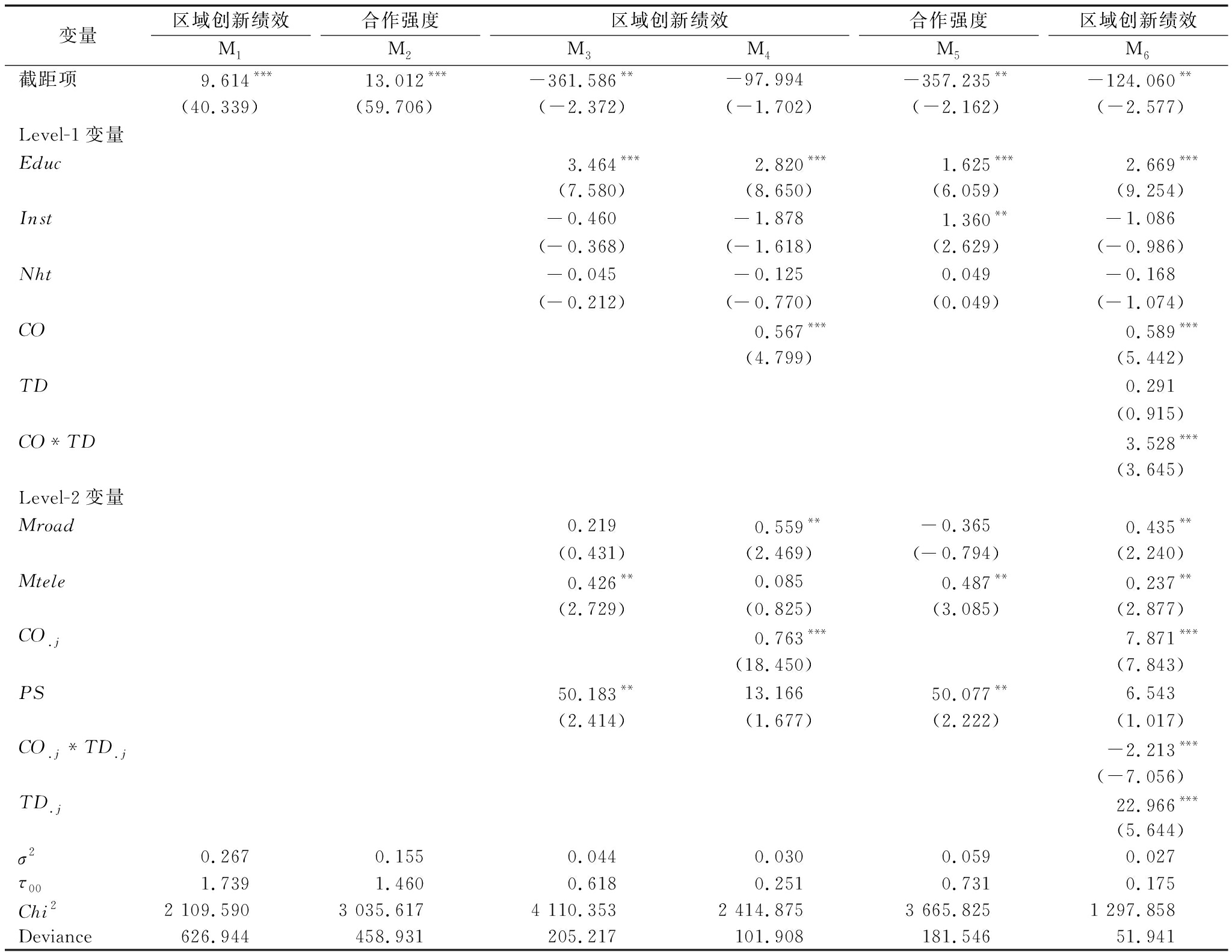 变量区域创新绩效M1合作强度M2区域创新绩效M3M4合作强度M5区域创新绩效M6截距项9.614***13.012***-361.586**-97.994-357.235**-124.060**(40.339)(59.706)(-2.372)(-1.702)(-2.162)(-2.577)Level-1变量Educ3.464***2.820***1.625***2.669***(7.580)(8.650)(6.059)(9.254)Inst-0.460-1.8781.360**-1.086(-0.368)(-1.618)(2.629)(-0.986)Nht-0.045-0.1250.049-0.168(-0.212)(-0.770)(0.049)(-1.074)CO0.567***0.589***(4.799)(5.442)TD0.291(0.915)CO*TD3.528***(3.645)Level-2变量Mroad0.2190.559**-0.3650.435**(0.431)(2.469)(-0.794)(2.240)Mtele0.426**0.0850.487**0.237**(2.729)(0.825)(3.085)(2.877)CO.j0.763***7.871***(18.450)(7.843)PS50.183**13.16650.077**6.543(2.414)(1.677)(2.222)(1.017)CO.j*TD.j-2.213***(-7.056)TD.j22.966***(5.644)σ20.2670.1550.0440.0300.0590.027τ001.7391.4600.6180.2510.7310.175Chi22 109.5903 035.6174 110.3532 414.8753 665.8251 297.858Deviance626.944458.931205.217101.908181.54651.941