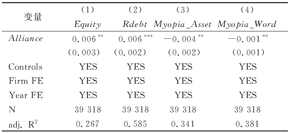 变量(1)(2)(3)(4)EquityRdebtMyopia_AssetMyopia_WordAlliance0.006**0.006***-0.004**-0.001**(0.003)(0.002)(0.002)(0.001)ControlsYESYESYESYESFirm FEYESYESYESYESYear FEYESYESYESYESN39 31839 31839 31839 318adj. R20.2670.5850.3410.381