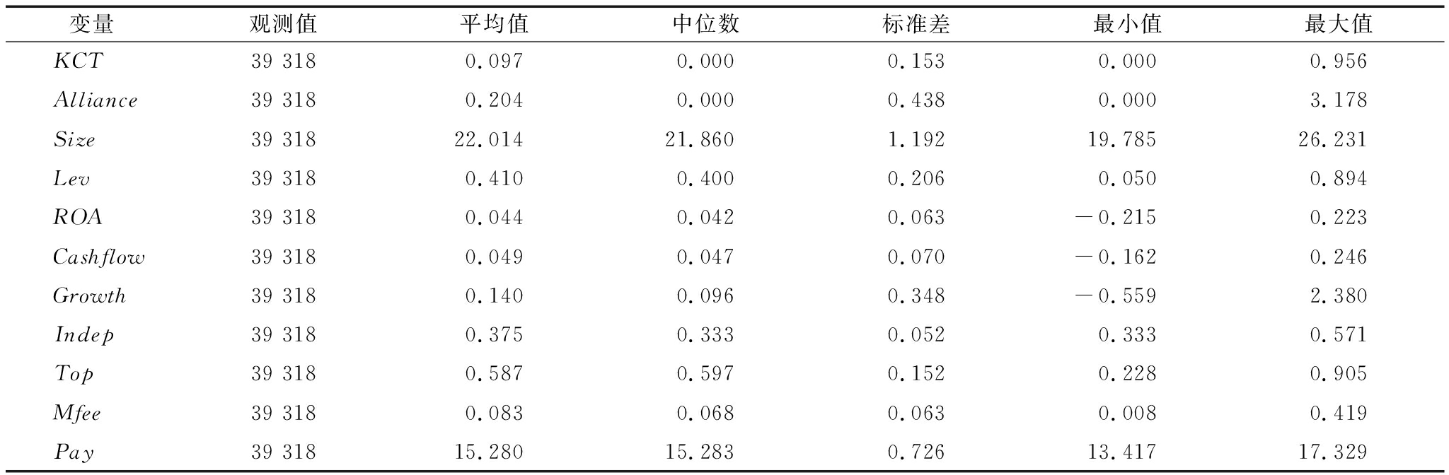 变量观测值平均值中位数标准差最小值最大值KCT39 3180.0970.0000.1530.0000.956Alliance39 3180.2040.0000.4380.0003.178Size39 31822.01421.8601.19219.78526.231Lev39 3180.4100.4000.2060.0500.894ROA39 3180.0440.0420.063-0.2150.223Cashflow39 3180.0490.0470.070-0.1620.246Growth39 3180.1400.0960.348-0.5592.380Indep39 3180.3750.3330.0520.3330.571Top39 3180.5870.5970.1520.2280.905Mfee39 3180.0830.0680.0630.0080.419Pay39 31815.28015.2830.72613.41717.329