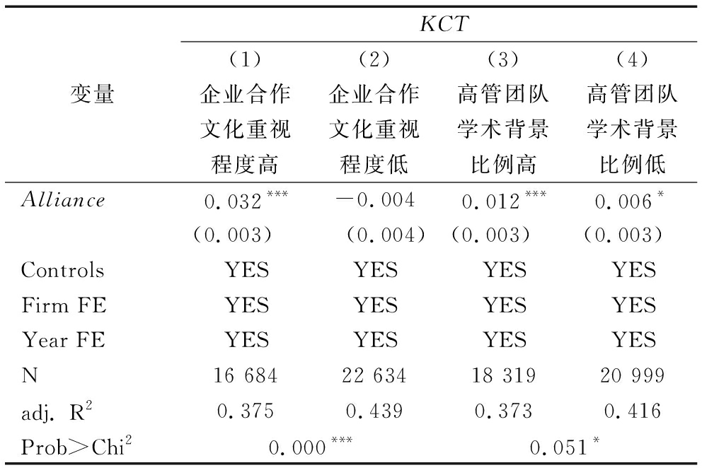 变量KCT(1)(2)(3)(4)企业合作文化重视程度高企业合作文化重视程度低高管团队学术背景比例高高管团队学术背景比例低Alliance0.032***-0.0040.012***0.006*(0.003)(0.004)(0.003)(0.003)ControlsYESYESYESYESFirm FEYESYESYESYESYear FEYESYESYESYESN16 68422 63418 31920 999adj. R20.3750.4390.3730.416Prob>Chi20.000***0.051*