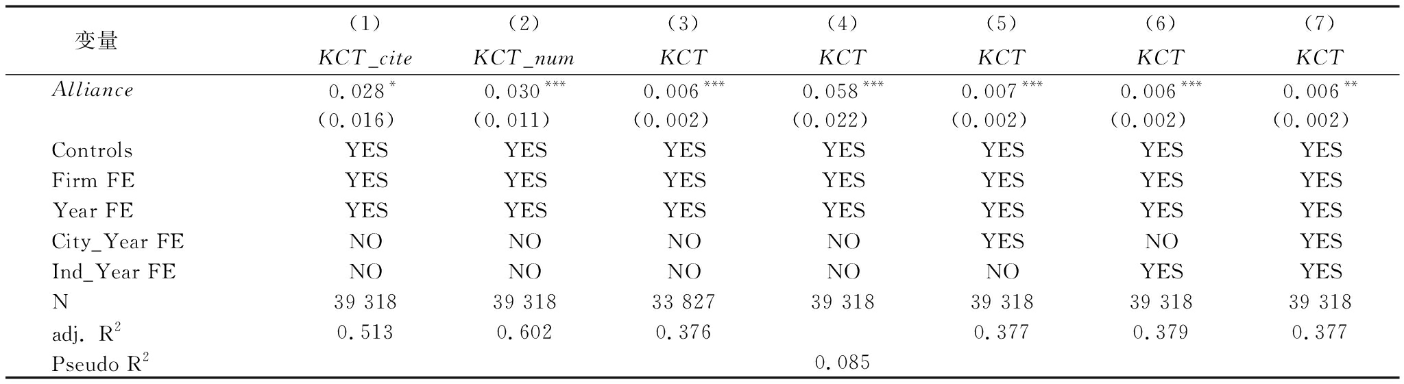 变量(1)(2)(3)(4)(5)(6)(7)KCT_citeKCT_numKCTKCTKCTKCTKCTAlliance0.028*0.030***0.006***0.058***0.007***0.006***0.006**(0.016)(0.011)(0.002)(0.022)(0.002)(0.002)(0.002)ControlsYESYESYESYESYESYESYESFirm FEYESYESYESYESYESYESYESYear FEYESYESYESYESYESYESYESCity_Year FENONONONOYESNOYESInd_Year FENONONONONOYESYESN39 31839 31833 82739 31839 31839 31839 318adj. R20.5130.6020.3760.3770.3790.377Pseudo R20.085