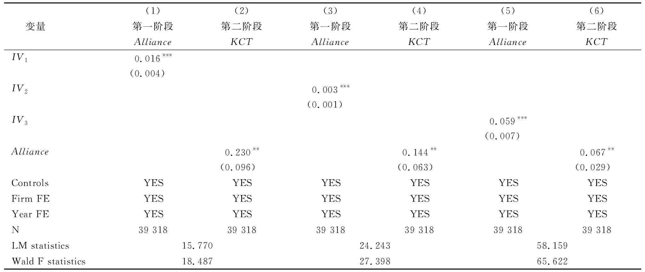 (1)(2)(3)(4)(5)(6)变量第一阶段第二阶段第一阶段第二阶段第一阶段第二阶段AllianceKCTAllianceKCTAllianceKCTIV10.016***(0.004)IV20.003***(0.001)IV30.059***(0.007)Alliance0.230**0.144**0.067**(0.096)(0.063)(0.029)ControlsYESYESYESYESYESYESFirm FEYESYESYESYESYESYESYear FEYESYESYESYESYESYESN39 31839 31839 31839 31839 31839 318LM statistics15.77024.24358.159Wald F statistics18.48727.39865.622