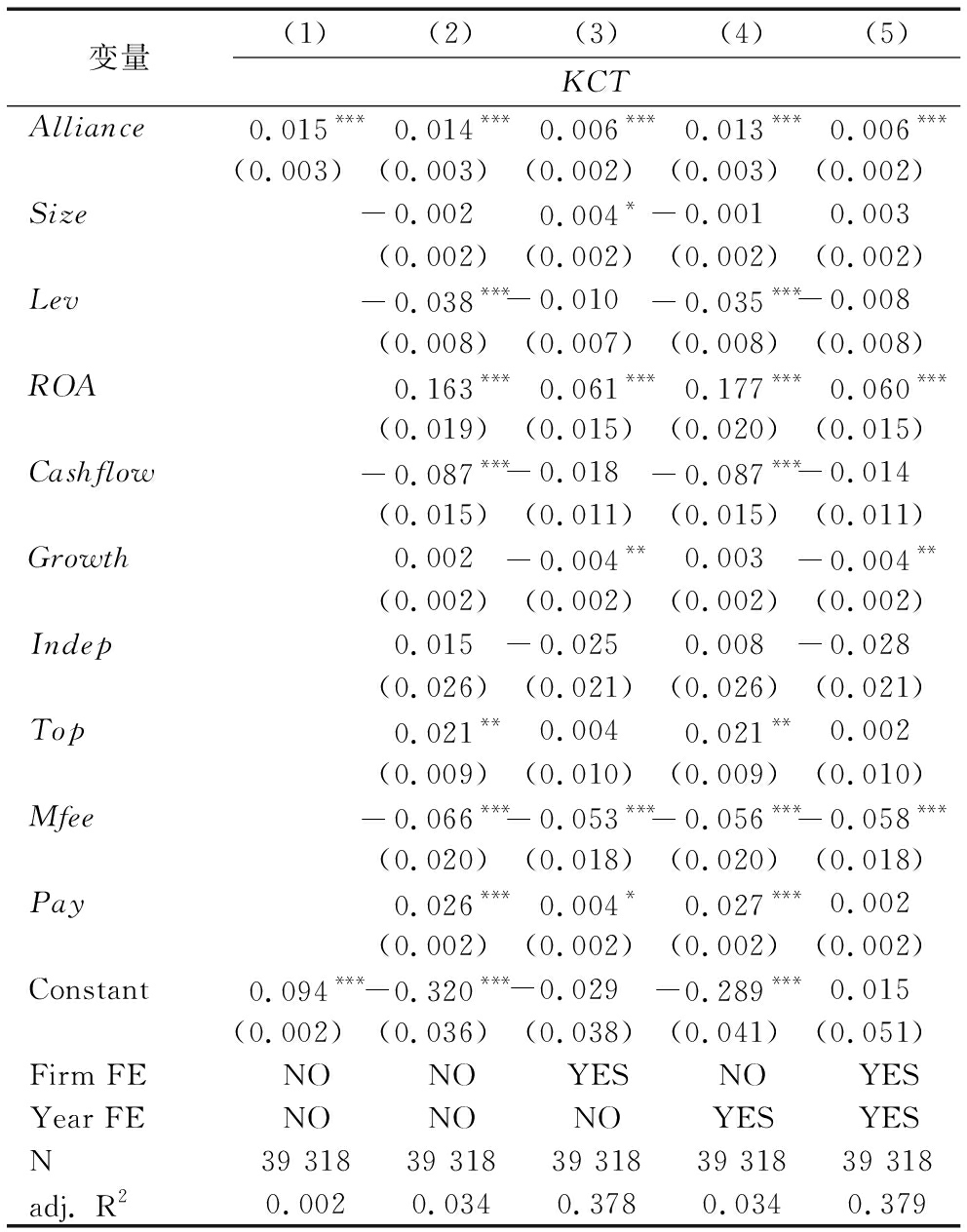 变量(1)(2)(3)(4)(5)KCTAlliance0.015***0.014***0.006***0.013***0.006***(0.003)(0.003)(0.002)(0.003)(0.002)Size-0.0020.004*-0.0010.003(0.002)(0.002)(0.002)(0.002)Lev-0.038***-0.010-0.035***-0.008(0.008)(0.007)(0.008)(0.008)ROA0.163***0.061***0.177***0.060***(0.019)(0.015)(0.020)(0.015)Cashflow-0.087***-0.018-0.087***-0.014(0.015)(0.011)(0.015)(0.011)Growth0.002-0.004**0.003-0.004**(0.002)(0.002)(0.002)(0.002)Indep0.015-0.0250.008-0.028(0.026)(0.021)(0.026)(0.021)Top0.021**0.0040.021**0.002(0.009)(0.010)(0.009)(0.010)Mfee-0.066***-0.053***-0.056***-0.058***(0.020)(0.018)(0.020)(0.018)Pay0.026***0.004*0.027***0.002(0.002)(0.002)(0.002)(0.002)Constant0.094***-0.320***-0.029-0.289***0.015(0.002)(0.036)(0.038)(0.041)(0.051)Firm FENONOYESNOYESYear FENONONOYESYESN39 31839 31839 31839 31839 318adj. R20.0020.0340.3780.0340.379
