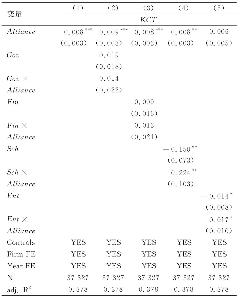 变量(1)(2)(3)(4)(5)KCTAlliance0.008***0.009***0.008***0.008**0.006(0.003)(0.003)(0.003)(0.003)(0.005)Gov-0.019(0.018)Gov×Alliance0.014(0.022)Fin0.009(0.016)Fin×Alliance-0.013(0.021)Sch-0.150**(0.073)Sch×Alliance0.224**(0.103)Ent-0.014*(0.008)Ent×Alliance0.017*(0.010)ControlsYESYESYESYESYESFirm FEYESYESYESYESYESYear FEYESYESYESYESYESN37 32737 32737 32737 32737 327adj. R20.3780.3780.3780.3780.378