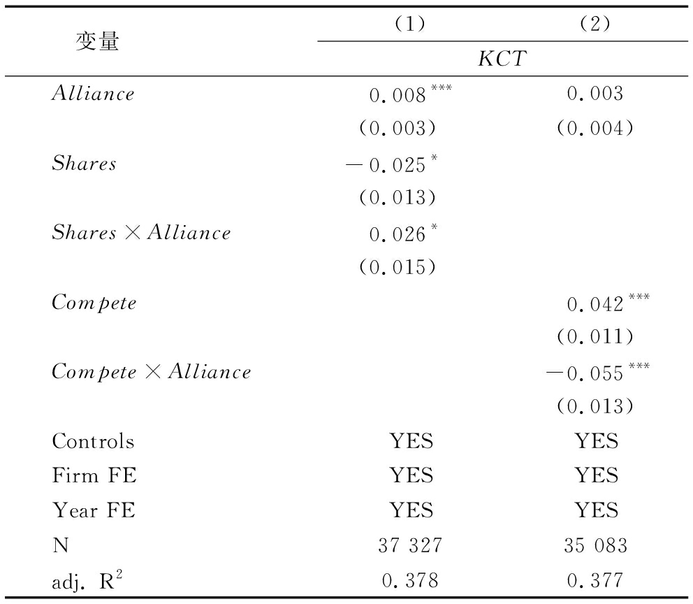 变量(1)(2)KCTAlliance0.008***0.003(0.003)(0.004)Shares-0.025*(0.013)Shares×Alliance0.026*(0.015)Compete0.042***(0.011)Compete×Alliance-0.055***(0.013)ControlsYESYESFirm FEYESYESYear FEYESYESN37 32735 083adj. R20.3780.377