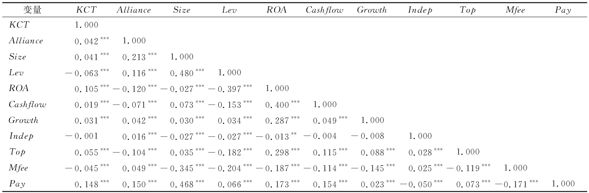 变量KCTAllianceSizeLevROACashflowGrowthIndepTopMfeePayKCT1.000Alliance0.042***1.000Size0.041***0.213***1.000Lev-0.063***0.116***0.480***1.000ROA0.105***-0.120***-0.027***-0.397***1.000Cashflow0.019***-0.071***0.073***-0.153***0.400***1.000Growth0.031***0.042***0.030***0.034***0.287***0.049***1.000Indep-0.0010.016***-0.027***-0.027***-0.013**-0.004-0.0081.000Top0.055***-0.104***0.035***-0.182***0.298***0.115***0.088***0.028***1.000Mfee-0.045***0.049***-0.345***-0.204***-0.187***-0.114***-0.145***0.025***-0.119***1.000Pay0.148***0.150***0.468***0.066***0.173***0.154***0.023***-0.050***0.073***-0.171***1.000
