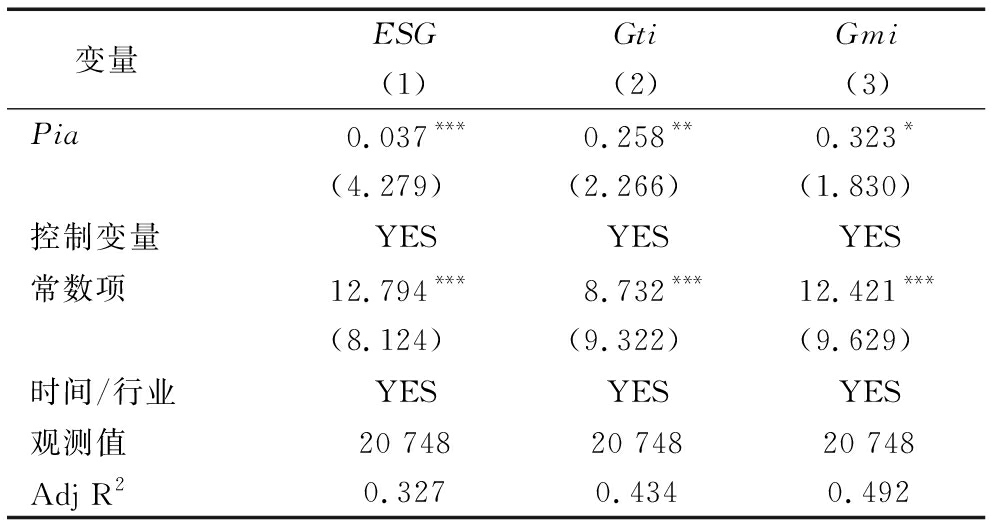 变量ESGGtiGmi(1)(2)(3)Pia0.037***0.258**0.323*(4.279)(2.266)(1.830)控制变量YESYESYES常数项12.794***8.732***12.421***(8.124)(9.322)(9.629)时间/行业YESYESYES观测值20 74820 74820 748Adj R20.3270.4340.492