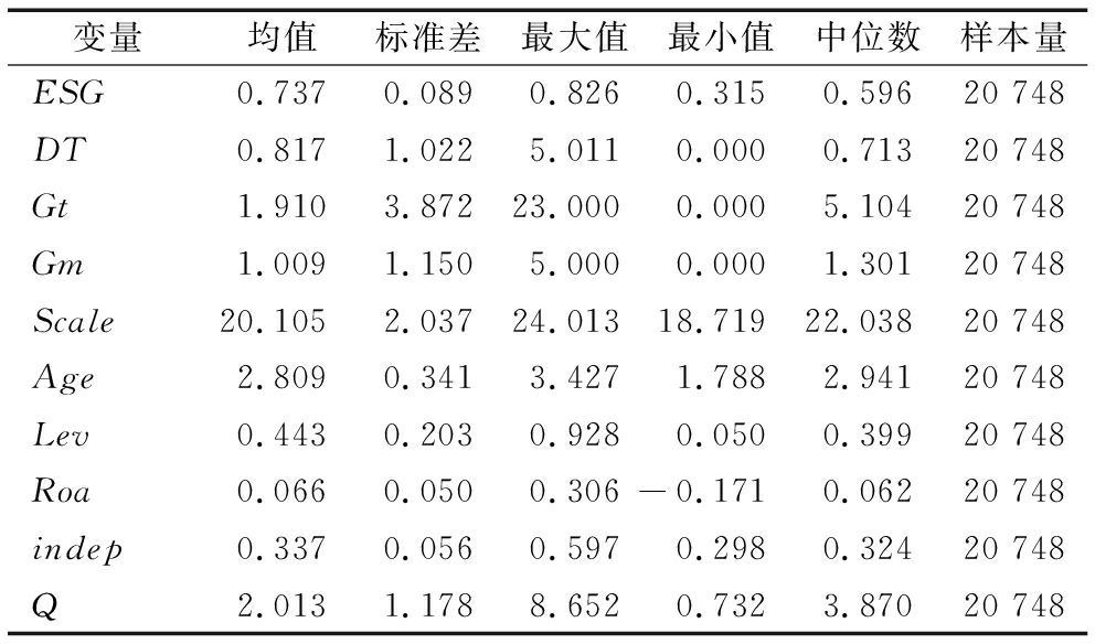 变量均值标准差最大值最小值中位数样本量ESG0.7370.0890.8260.3150.59620 748DT0.8171.0225.0110.0000.71320 748 Gt1.9103.87223.0000.0005.10420 748Gm1.0091.1505.0000.0001.30120 748Scale20.1052.03724.01318.71922.03820 748Age2.8090.3413.4271.7882.94120 748Lev0.4430.2030.9280.0500.39920 748Roa0.0660.0500.306-0.1710.06220 748indep0.3370.0560.5970.2980.32420 748Q2.0131.1788.6520.7323.87020 748