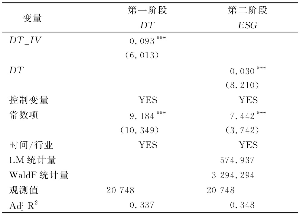 变量第一阶段第二阶段DTESGDT_IV0.093***(6.013)DT0.030***(8.210)控制变量YESYES常数项9.184***7.442***(10.349)(3.742)时间/行业YESYESLM统计量574.937WaldF统计量3 294.294观测值20 74820 748Adj R20.3370.348