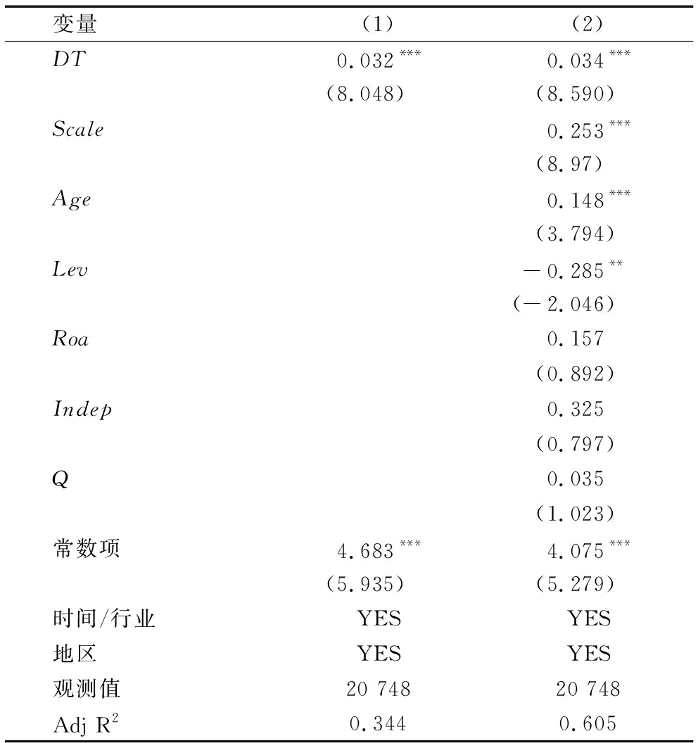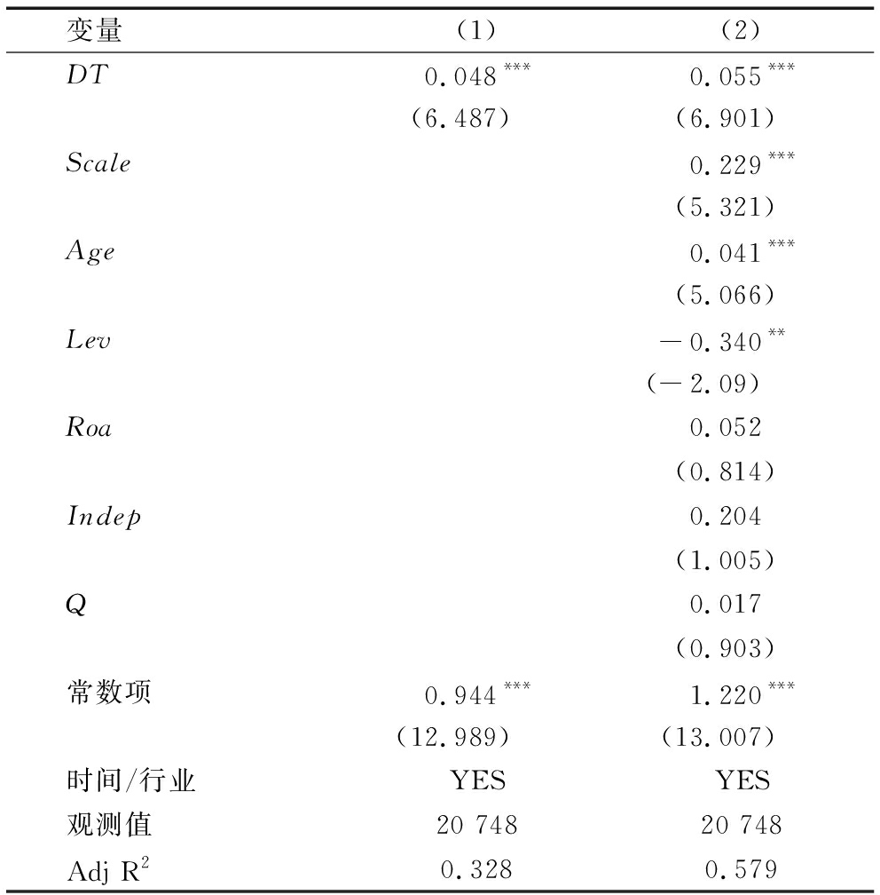 变量(1)(2)DT0.032***0.034***(8.048)(8.590)Scale0.253***(8.97)Age0.148***(3.794)Lev-0.285**(-2.046)Roa0.157(0.892)Indep0.325(0.797)Q0.035(1.023)常数项4.683***4.075***(5.935)(5.279)时间/行业YESYES地区YESYES观测值20 74820 748Adj R20.3440.605