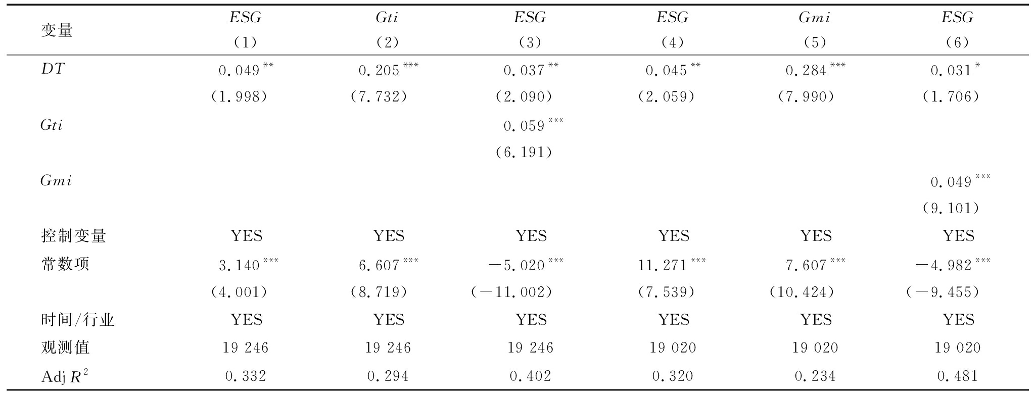 变量ESGGtiESGESGGmiESG(1)(2)(3)(4)(5)(6)DT0.049**0.205***0.037**0.045**0.284***0.031*(1.998)(7.732)(2.090)(2.059)(7.990)(1.706)Gti0.059***(6.191)Gmi0.049***(9.101)控制变量YESYESYESYESYESYES常数项3.140***6.607***-5.020***11.271***7.607***-4.982***(4.001)(8.719)(-11.002)(7.539)(10.424)(-9.455)时间/行业YESYESYESYESYESYES观测值19 24619 24619 24619 02019 02019 020AdjR20.3320.2940.4020.3200.2340.481