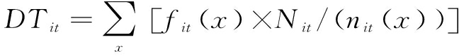 其中,fit(x)为数字化转型关键词x在t年企业i的年报中出现频次,关键词x的逆文本频率由Nit/nit(x)计算得出,Nit表示在t年获得的企业i年报总数,nit(x)表示在t年获得的包含关键词x的企业i年报数量。对计算结果取对数,以此衡量数字化转型。