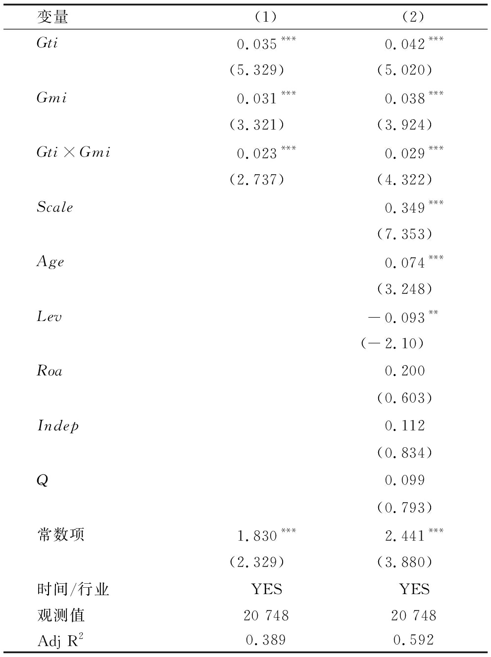 变量(1)(2)Gti0.035***0.042***(5.329)(5.020)Gmi0.031***0.038***(3.321)(3.924)Gti×Gmi0.023***0.029***(2.737)(4.322)Scale0.349***(7.353)Age0.074***(3.248)Lev-0.093**(-2.10)Roa0.200(0.603)Indep0.112(0.834)Q0.099(0.793)常数项1.830***2.441***(2.329)(3.880)时间/行业YESYES观测值20 74820 748Adj R20.3890.592