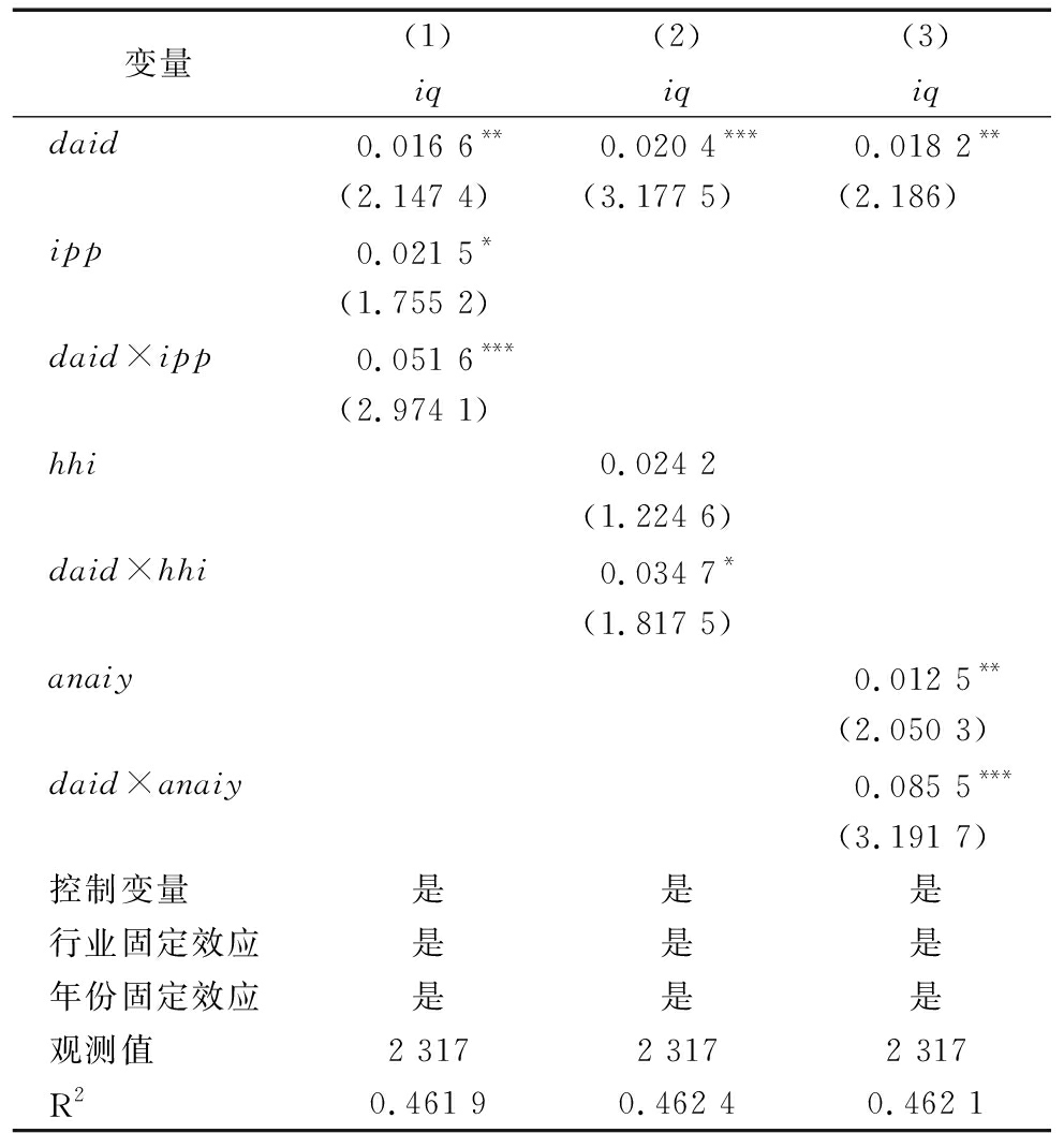 变量(1)iq(2)iq(3)iqdaid0.016 6**0.020 4***0.018 2**(2.147 4)(3.177 5)(2.186)ipp0.021 5*(1.755 2)daid×ipp0.051 6***(2.974 1)hhi0.024 2(1.224 6)daid×hhi0.034 7*(1.817 5)anaiy0.012 5**(2.050 3)daid×anaiy0.085 5***(3.191 7)控制变量是是是行业固定效应是是是年份固定效应是是是观测值2 3172 3172 317R20.461 90.462 40.462 1