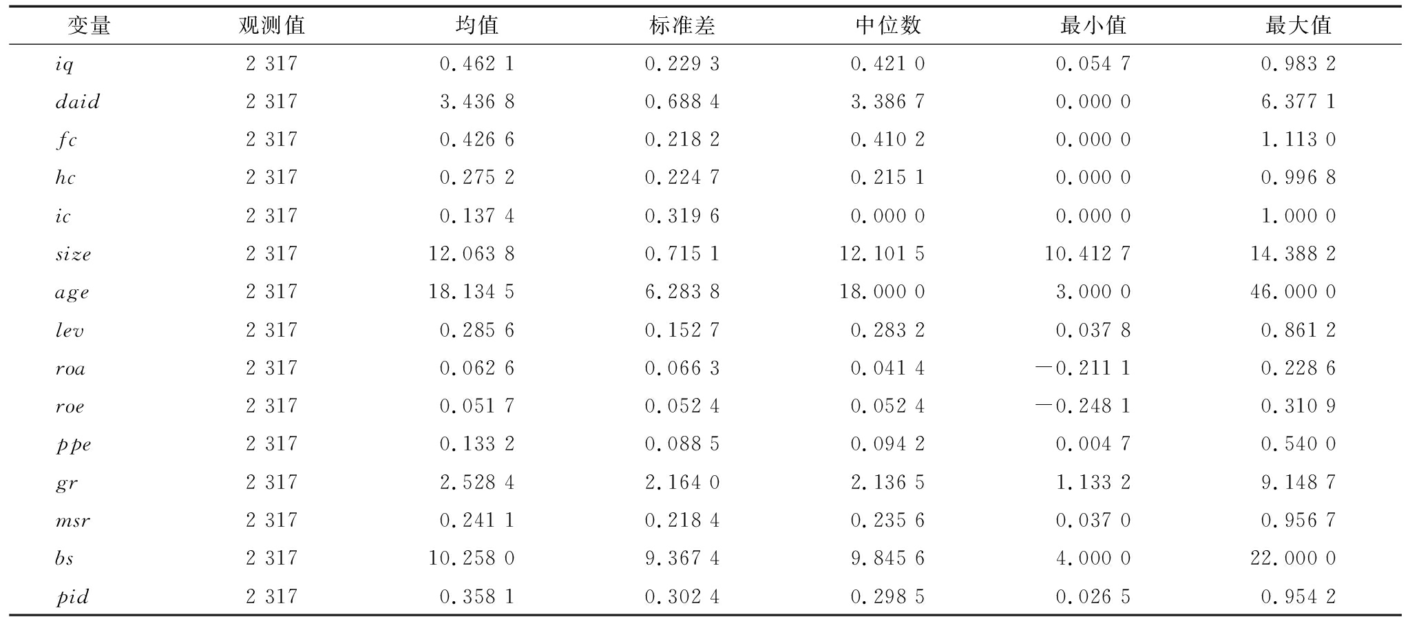 变量观测值均值标准差中位数最小值最大值iq2 3170.462 10.229 30.421 00.054 70.983 2daid2 3173.436 80.688 43.386 70.000 06.377 1fc2 3170.426 60.218 20.410 20.000 01.113 0hc2 3170.275 20.224 70.215 10.000 00.996 8ic2 3170.137 40.319 60.000 00.000 01.000 0size2 31712.063 80.715 112.101 510.412 714.388 2age2 31718.134 56.283 818.000 03.000 046.000 0lev2 3170.285 60.152 70.283 20.037 80.861 2roa2 3170.062 60.066 30.041 4-0.211 10.228 6roe2 3170.051 70.052 40.052 4-0.248 10.310 9ppe2 3170.133 20.088 50.094 20.004 70.540 0gr2 3172.528 42.164 02.136 51.133 29.148 7msr2 3170.241 10.218 40.235 60.037 00.956 7bs2 31710.258 09.367 49.845 64.000 022.000 0pid2 3170.358 10.302 40.298 50.026 50.954 2