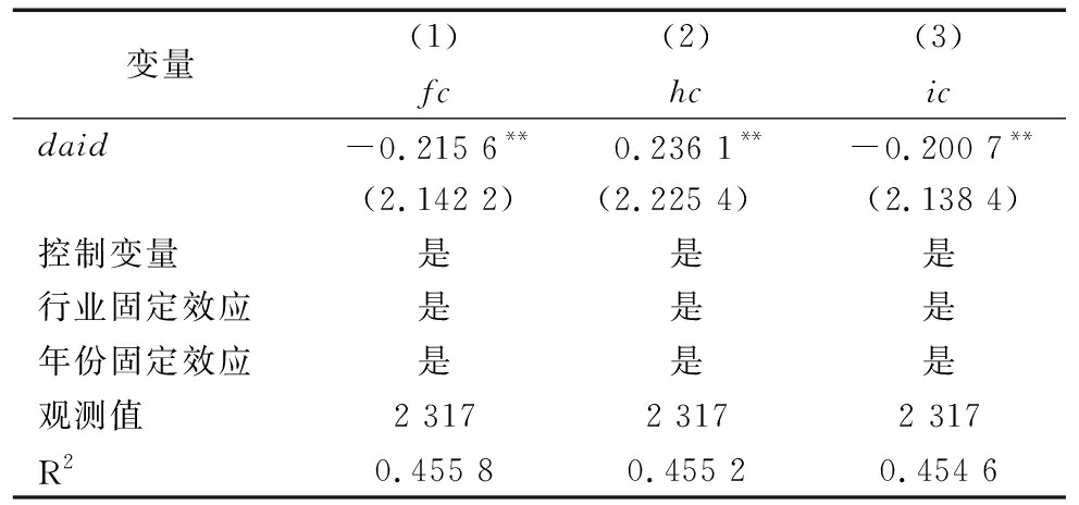 变量(1)fc(2)hc(3)icdaid-0.215 6**0.236 1**-0.200 7**(2.142 2)(2.225 4)(2.138 4)控制变量是是是行业固定效应是是是年份固定效应是是是观测值2 3172 3172 317R20.455 80.455 20.454 6