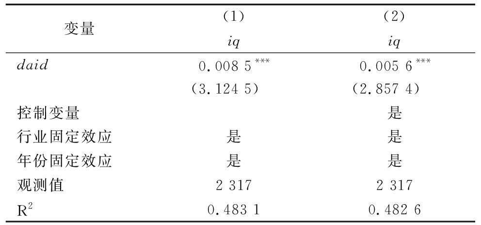 变量(1)iq(2)iqdaid0.008 5***0.005 6***(3.124 5)(2.857 4)控制变量是行业固定效应是是年份固定效应是是观测值2 3172 317R20.483 10.482 6