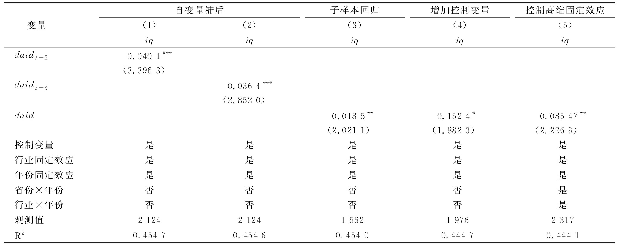 变量 自变量滞后(1)iq(2)iq子样本回归(3)iq增加控制变量(4)iq控制高维固定效应(5)iqdaidt-20.040 1***(3.396 3)daidt-30.036 4***(2.852 0)daid0.018 5**0.152 4*0.085 47**(2.021 1)(1.882 3)(2.226 9)控制变量是是是是是行业固定效应是是是是是年份固定效应是是是是是省份×年份否否否否是行业×年份否否否否是观测值2 1242 1241 5621 9762 317R20.454 70.454 60.454 00.444 70.444 1