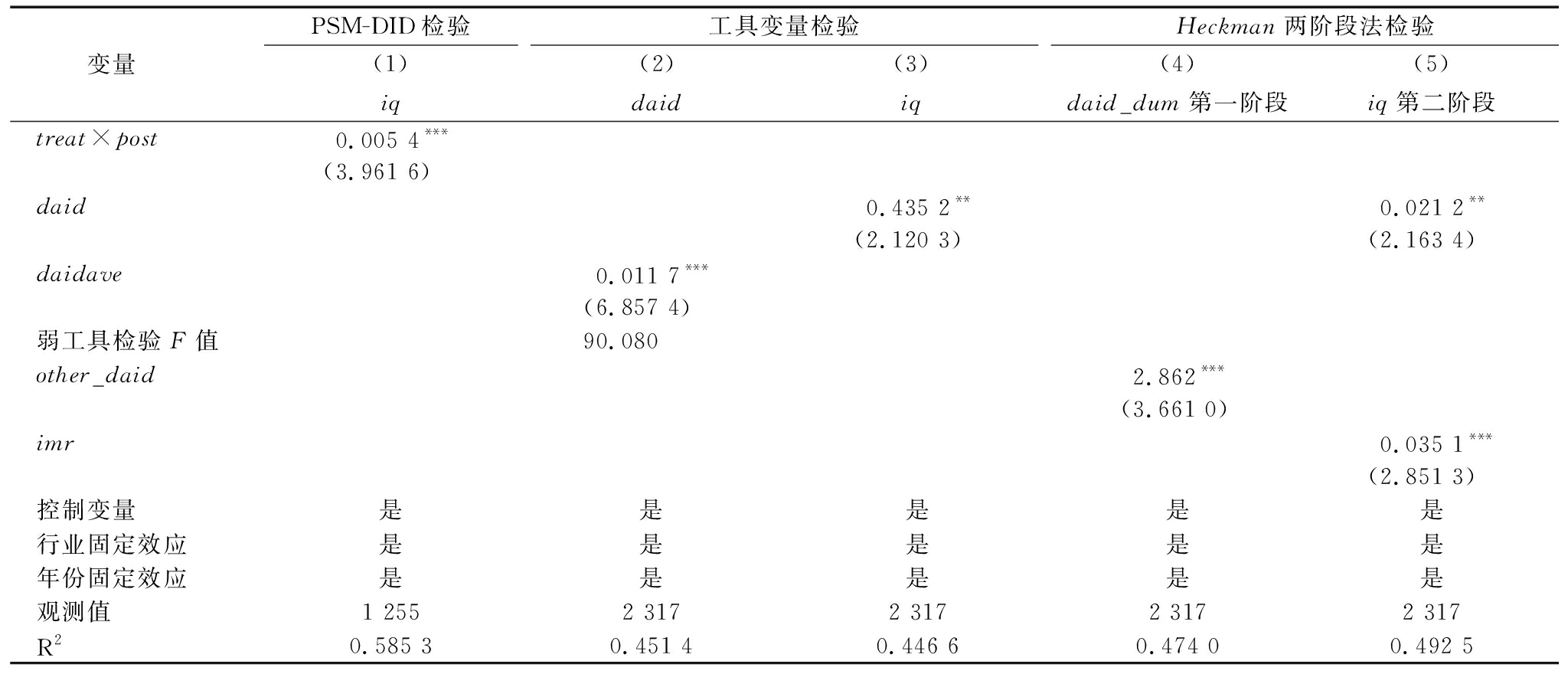 变量 PSM-DID检验(1)iq工具变量检验(2)daid(3)iqHeckman两阶段法检验(4)daid_dum第一阶段(5)iq第二阶段treat×post0.005 4***(3.961 6)daid0.435 2**0.021 2**(2.120 3)(2.163 4)daidave0.011 7***(6.857 4)弱工具检验F值90.080other_daid2.862***(3.661 0)imr0.035 1***(2.851 3)控制变量是是是是是行业固定效应是是是是是年份固定效应是是是是是观测值1 2552 3172 3172 3172 317R20.585 30.451 40.446 60.474 00.492 5