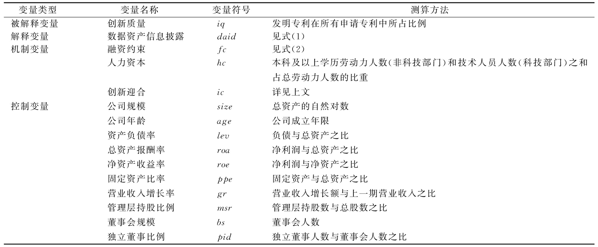变量类型 变量名称 变量符号测算方法被解释变量创新质量iq发明专利在所有申请专利中所占比例解释变量数据资产信息披露daid见式(1)机制变量融资约束fc见式(2)人力资本hc本科及以上学历劳动力人数(非科技部门)和技术人员人数(科技部门)之和占总劳动力人数的比重创新迎合ic详见上文控制变量公司规模size总资产的自然对数公司年龄age公司成立年限资产负债率lev负债与总资产之比总资产报酬率roa净利润与总资产之比净资产收益率roe净利润与净资产之比固定资产比率ppe固定资产与总资产之比营业收入增长率gr营业收入增长额与上一期营业收入之比管理层持股比例msr管理层持股数与总股数之比董事会规模bs董事会人数独立董事比例pid独立董事人数与董事会人数之比