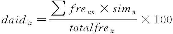 其中,daidit 为数据资产信息披露频率。freitn 代表公司i在第t年年度报告及新闻稿特定词典中第n个词汇的精确出现频次。simn 反映该词典中第n个词汇与预设种子词汇间的相似程度。其中,种子词汇本身的相似度simn 被设定为1。totalfreit 为公司i在第t年年度报告及新闻稿中(去除英文和数字后)所有词汇的总出现频次。