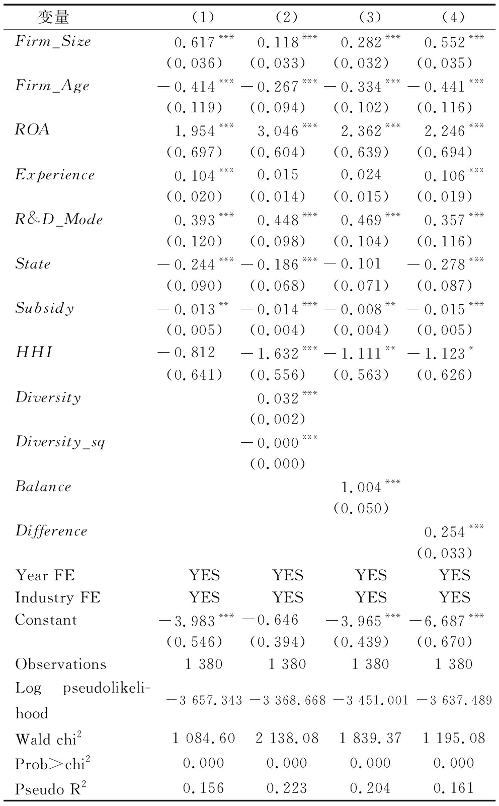 变量(1)(2)(3)(4)Firm_Size0.617***0.118***0.282***0.552***(0.036)(0.033)(0.032)(0.035)Firm_Age-0.414***-0.267***-0.334***-0.441***(0.119)(0.094)(0.102)(0.116)ROA1.954***3.046***2.362***2.246***(0.697)(0.604)(0.639)(0.694)Experience0.104***0.0150.0240.106***(0.020)(0.014)(0.015)(0.019)R&D_Mode0.393***0.448***0.469***0.357***(0.120)(0.098)(0.104)(0.116)State-0.244***-0.186***-0.101-0.278***(0.090)(0.068)(0.071)(0.087)Subsidy-0.013**-0.014***-0.008**-0.015***(0.005)(0.004)(0.004)(0.005)HHI-0.812-1.632***-1.111**-1.123*(0.641)(0.556)(0.563)(0.626)Diversity0.032***(0.002)Diversity_sq-0.000***(0.000)Balance1.004***(0.050)Difference0.254***(0.033)Year FEYESYESYESYESIndustry FEYESYESYESYESConstant-3.983***-0.646-3.965***-6.687***(0.546)(0.394)(0.439)(0.670)Observations1 3801 3801 3801 380Log pseudolikeli-hood-3 657.343 -3 368.668 -3 451.001 -3 637.489Wald chi21 084.602 138.081 839.371 195.08Prob>chi20.000 0.000 0.000 0.000 Pseudo R20.156 0.223 0.204 0.161