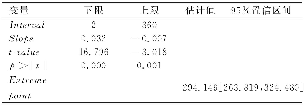 变量下限上限估计值95%置信区间Interval2360Slope0.032-0.007 t-value16.796 -3.018p>|t| 0.0000.001Extreme point294.149[263.819,324.480]