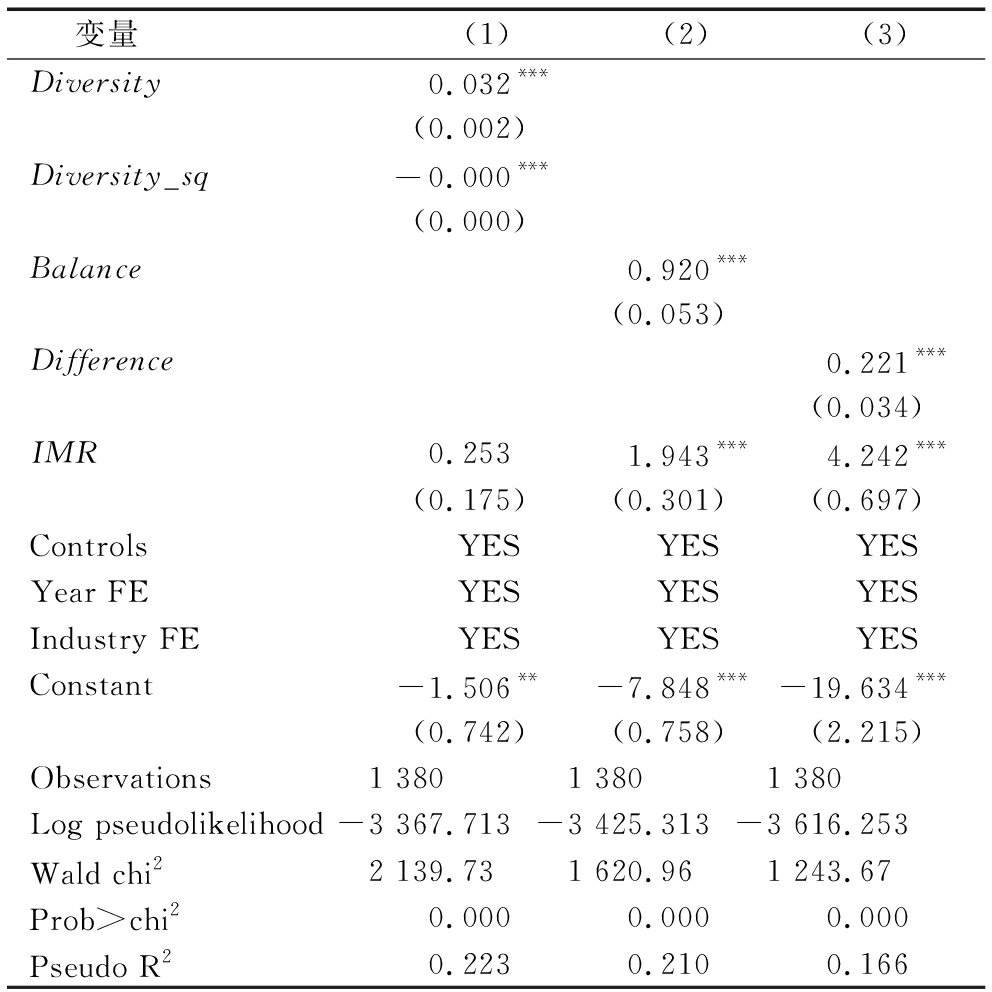 变量(1)(2)(3)Diversity0.032***(0.002)Diversity_sq-0.000***(0.000)Balance0.920***(0.053)Difference0.221***(0.034)IMR0.2531.943***4.242***(0.175)(0.301)(0.697)ControlsYESYESYESYear FEYESYESYESIndustry FEYESYESYESConstant-1.506**-7.848***-19.634***(0.742)(0.758)(2.215)Observations1 3801 3801 380Log pseudolikelihood-3 367.713 -3 425.313 -3 616.253 Wald chi22 139.731 620.961 243.67Prob>chi20.000 0.000 0.000 Pseudo R2 0.223 0.2100.166