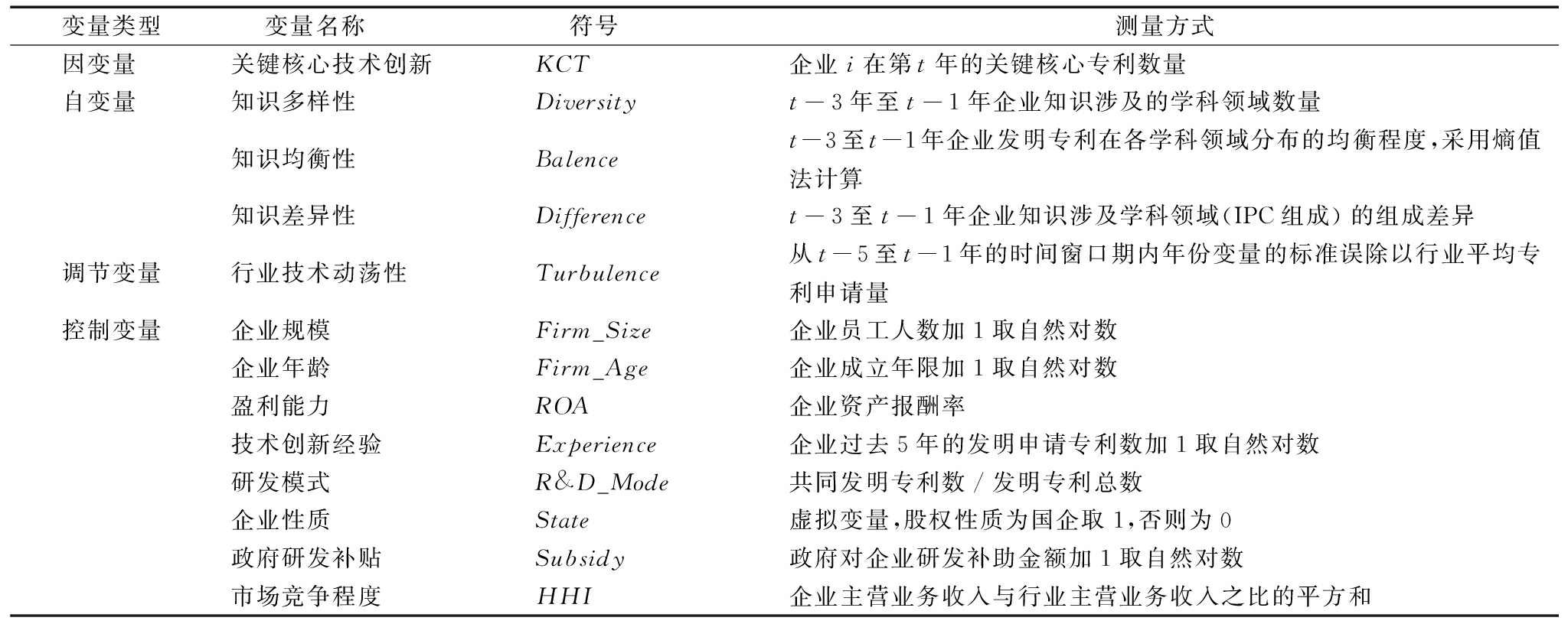 其中,i和t分别表示企业个体与观测年份。KCTi,t表示i企业第t年关键核心技术创新水平,Diversityi,t、Balancei,t、Differencei,t分别表示企业知识多样性、知识均衡性和知识差异性特征,Diversity_sqi,t为知识多样性的二次项,Turbulencei,t为企业所处行业的技术动荡性。Controlsi,t表示一系列控制变量,IndustryFE和YearFE分别表示行业与年份固定效应,εi,t为随机扰动项。