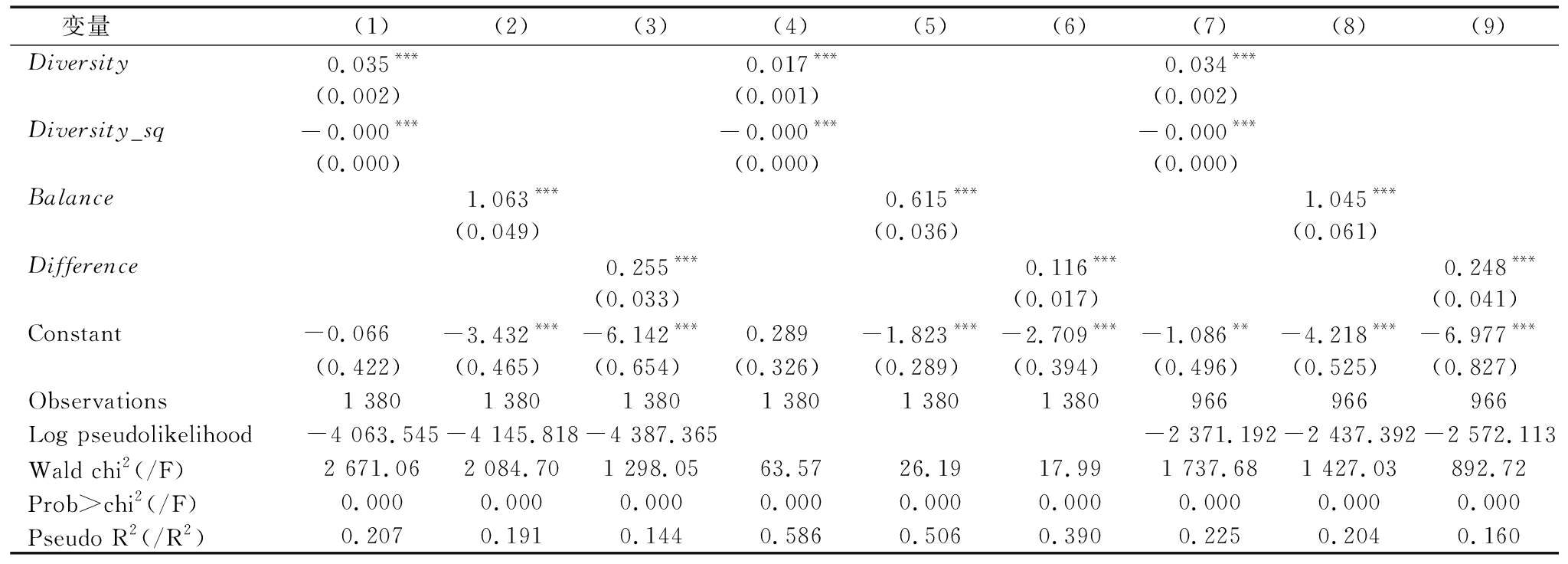 变量(1)(2)(3)(4)(5)(6)(7)(8)(9)Diversity0.035***0.017***0.034***(0.002)(0.001)(0.002)Diversity_sq-0.000***-0.000***-0.000***(0.000)(0.000)(0.000)Balance1.063***0.615***1.045***(0.049)(0.036)(0.061)Difference0.255***0.116***0.248***(0.033)(0.017)(0.041)Constant-0.066-3.432***-6.142***0.289-1.823***-2.709***-1.086**-4.218***-6.977***(0.422)(0.465)(0.654)(0.326)(0.289)(0.394)(0.496)(0.525)(0.827)Observations1 3801 3801 3801 3801 3801 380966966966Log pseudolikelihood-4 063.545-4 145.818-4 387.365 -2 371.192-2 437.392-2 572.113Wald chi2(/F)2 671.062 084.701 298.0563.5726.1917.991 737.681 427.03892.72Prob>chi2(/F)0.000 0.000 0.000 0.0000.000 0.000 0.000 0.000 0.000 Pseudo R2(/R2)0.207 0.191 0.144 0.5860.5060.390 0.225 0.2040.160