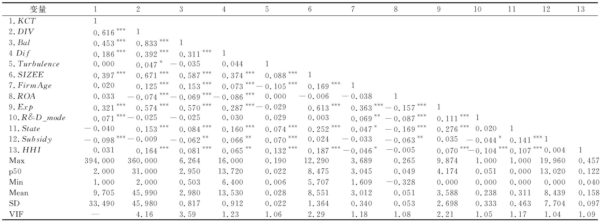 变量123456789101112131.KCT 12.DIV0.616***13.Bal 0.453***0.833***14 Dif 0.186***0.392***0.311***15.Turbulence 0.0000.047*-0.0350.04416.SIZEE 0.397***0.671***0.587***0.374***0.088***17.FirmAge0.0200.125***0.153***0.073***-0.105***0.169***18.ROA 0.033-0.074***-0.069***-0.086***0.000-0.006-0.03819.Exp 0.321***0.574***0.570***0.287***-0.0290.613***0.363***-0.157***110.R&D_mode0.071***-0.025-0.0250.0300.0290.0030.069**-0.087***0.111***111.State -0.0400.153***0.084***0.160***0.074***0.252***0.047*-0.169***0.276***0.020112.Subsidy -0.098***-0.009-0.062**0.066**0.070***0.024-0.033-0.063**0.035-0.044*0.141***113.HHI0.0310.164***0.081***0.065**0.132***0.187***-0.046*-0.0050.070***-0.104***0.107***0.0041Max394.000360.0006.26416.0000.19012.2903.6890.2659.8741.0001.00019.9600.457p502.00031.0002.95013.7200.0228.4753.0450.0494.1740.0510.00013.0200.122Min1.0002.0000.5036.4000.0065.7071.609-0.3280.0000.0000.0000.0000.040Mean9.70545.9902.98013.5300.0288.5513.0120.0513.5880.2380.3118.4390.158SD33.49045.9800.8170.9120.0221.3640.3400.0532.6980.3330.4637.7040.097VIF—4.163.591.231.062.291.181.082.211.051.171.041.09