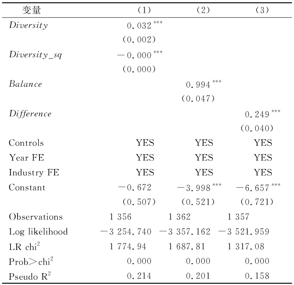 变量(1)(2)(3)Diversity0.032***(0.002)Diversity_sq-0.000***(0.000)Balance0.994***(0.047)Difference0.249***(0.040)ControlsYESYESYESYear FEYESYESYESIndustry FEYESYESYESConstant-0.672-3.998***-6.657***(0.507)(0.521)(0.721)Observations1 3561 3621 357Log likelihood-3 254.740 -3 357.162 -3 521.959 LR chi21 774.941 687.811 317.08Prob>chi20.000 0.000 0.000Pseudo R20.214 0.201 0.158