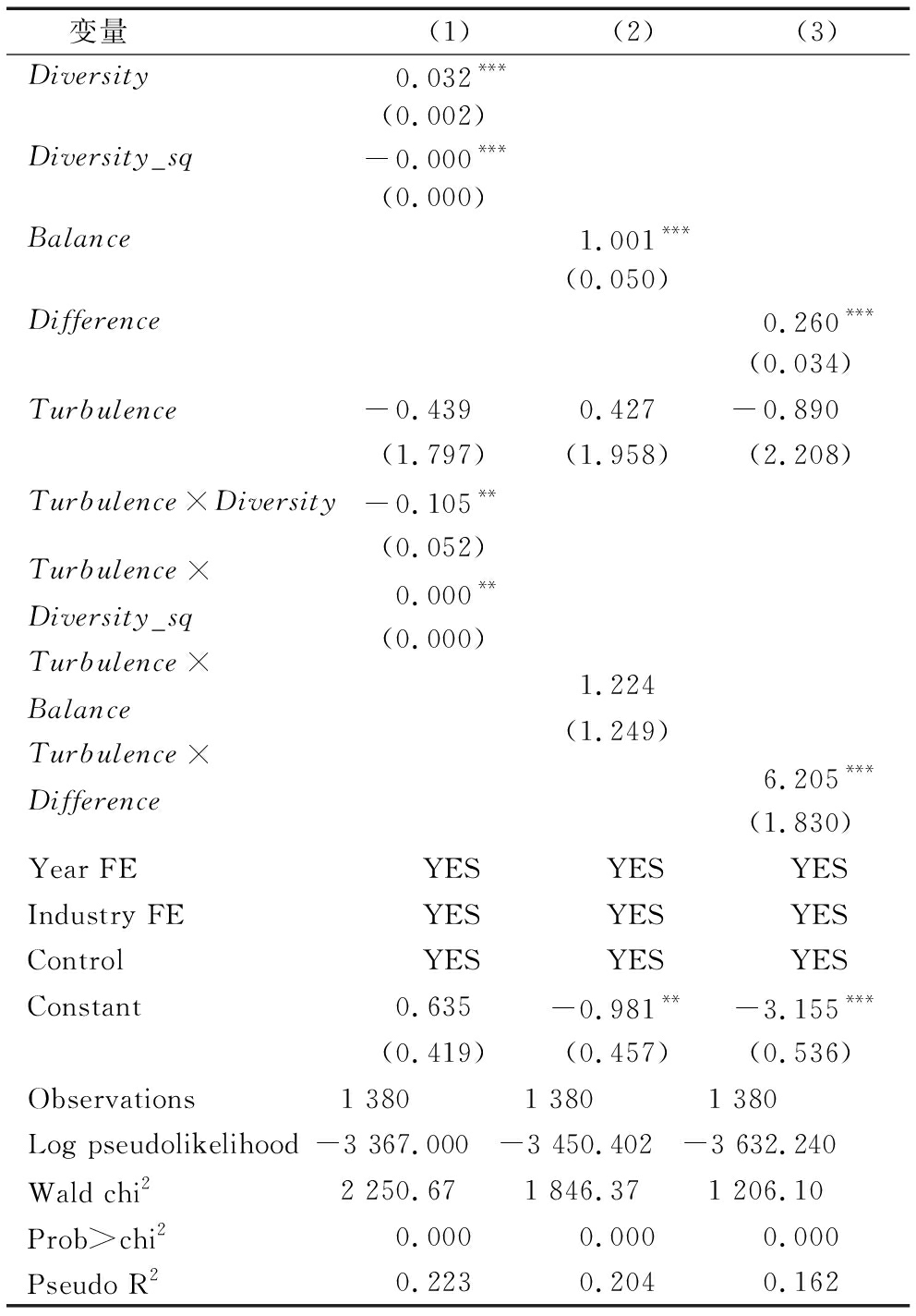 变量(1)(2)(3)Diversity0.032***(0.002)Diversity_sq-0.000***(0.000)Balance1.001***(0.050)Difference0.260***(0.034)Turbulence-0.4390.427-0.890(1.797)(1.958)(2.208)Turbulence×Diversity-0.105**(0.052)Turbulence×Diversity_sq0.000**(0.000)Turbulence×Balance1.224(1.249)Turbulence×Difference6.205***(1.830)Year FEYESYESYESIndustry FEYESYESYESControlYESYESYESConstant0.635-0.981**-3.155***(0.419)(0.457)(0.536)Observations1 3801 3801 380Log pseudolikelihood-3 367.000 -3 450.402-3 632.240 Wald chi22 250.671 846.37 1 206.10Prob>chi20.000 0.000 0.000 Pseudo R20.223 0.204 0.162