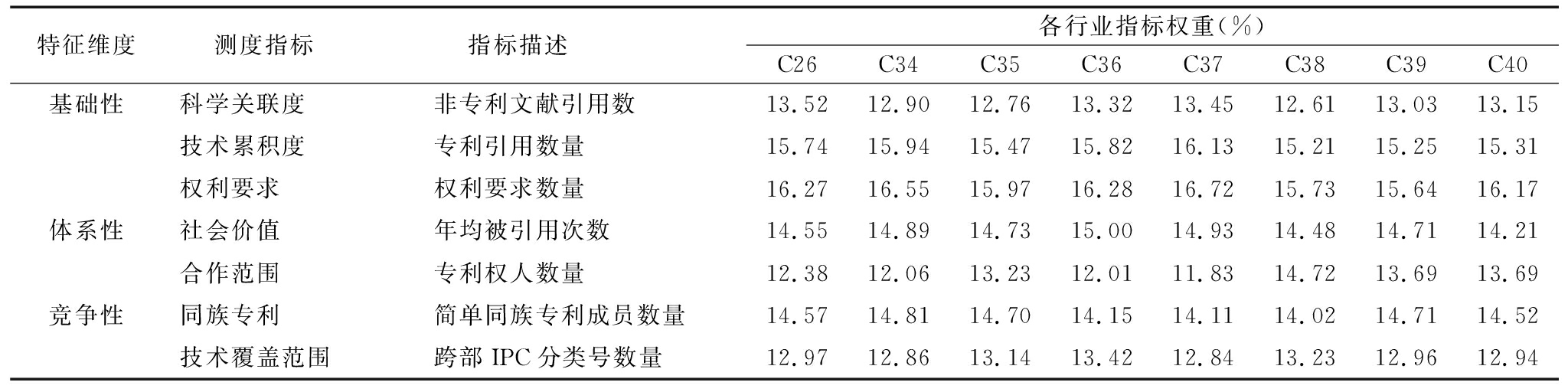 特征维度测度指标指标描述各行业指标权重(%)C26C34C35C36C37C38C39C40基础性科学关联度非专利文献引用数13.5212.9012.7613.3213.4512.6113.0313.15技术累积度专利引用数量15.7415.9415.4715.8216.1315.2115.2515.31权利要求权利要求数量16.2716.5515.9716.2816.7215.7315.6416.17体系性 社会价值年均被引用次数14.5514.8914.7315.0014.9314.4814.7114.21合作范围专利权人数量12.3812.0613.2312.0111.8314.7213.6913.69竞争性同族专利简单同族专利成员数量14.5714.8114.7014.1514.1114.0214.7114.52技术覆盖范围跨部IPC分类号数量12.9712.8613.1413.4212.8413.2312.9612.94
