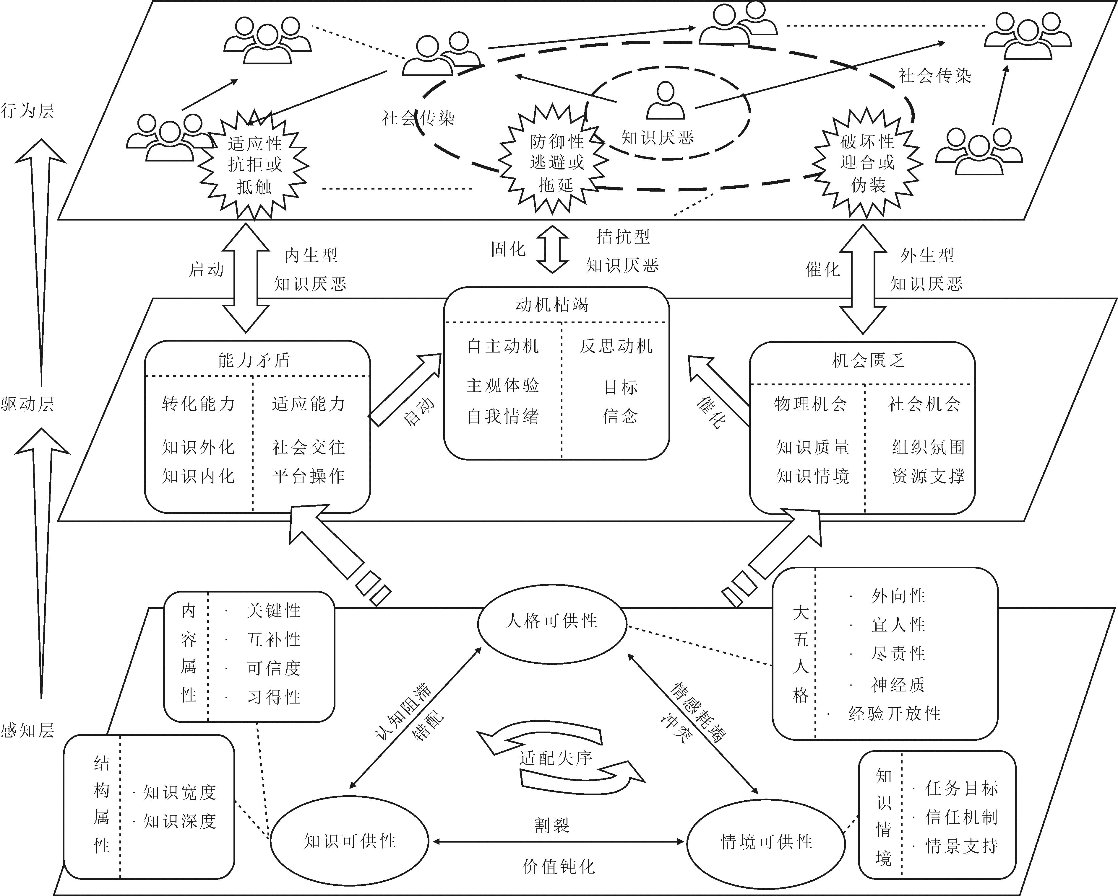 经过感知层的多维度可供性适配失序、驱动层的多因素驱动力协同失衡,成员的知识厌恶会进一步在行为层外显并向组织群体扩散。