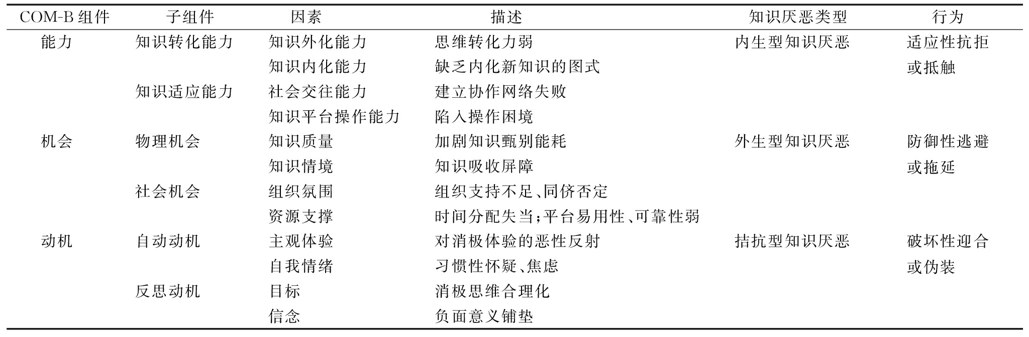 由知识厌恶定义可知,成员对知识活动中自我效能、知识价值和环境支持等方面的负面感知与判断会引发知识厌恶。COM-B模型可以较全面地涵盖知识厌恶形成的多方因素。其中,能力因素表征成员参与知识活动所具备的必要知识和技能,包括成员将知识内化与外化的知识转化能力,以及在社会交往、知识平台操作等方面的知识适应能力,它们影响成员在参与知识活动中对自我效能的判断;机会因素是指外部环境中存在的促使或支持成员参与知识活动的所有因素,包括知识本体提供的物理机会,以及外部组织情境提供的社会机会,它们影响成员对知识价值及环境支持的识别;动机因素表征激发和引导成员参与知识活动的心理机制,包括基于主观体验、自我情绪等产生的自动动机,以及基于目标、信念等产生的反思动机[6]。能力、机会、动机协同失衡将驱动成员知识厌恶产生。基于COM-B模型,本文从驱动层剖析影响知识厌恶形成的关键因素,并探索知识厌恶治理框架,为组织立足多角度识别和干预知识厌恶提供理论依据。