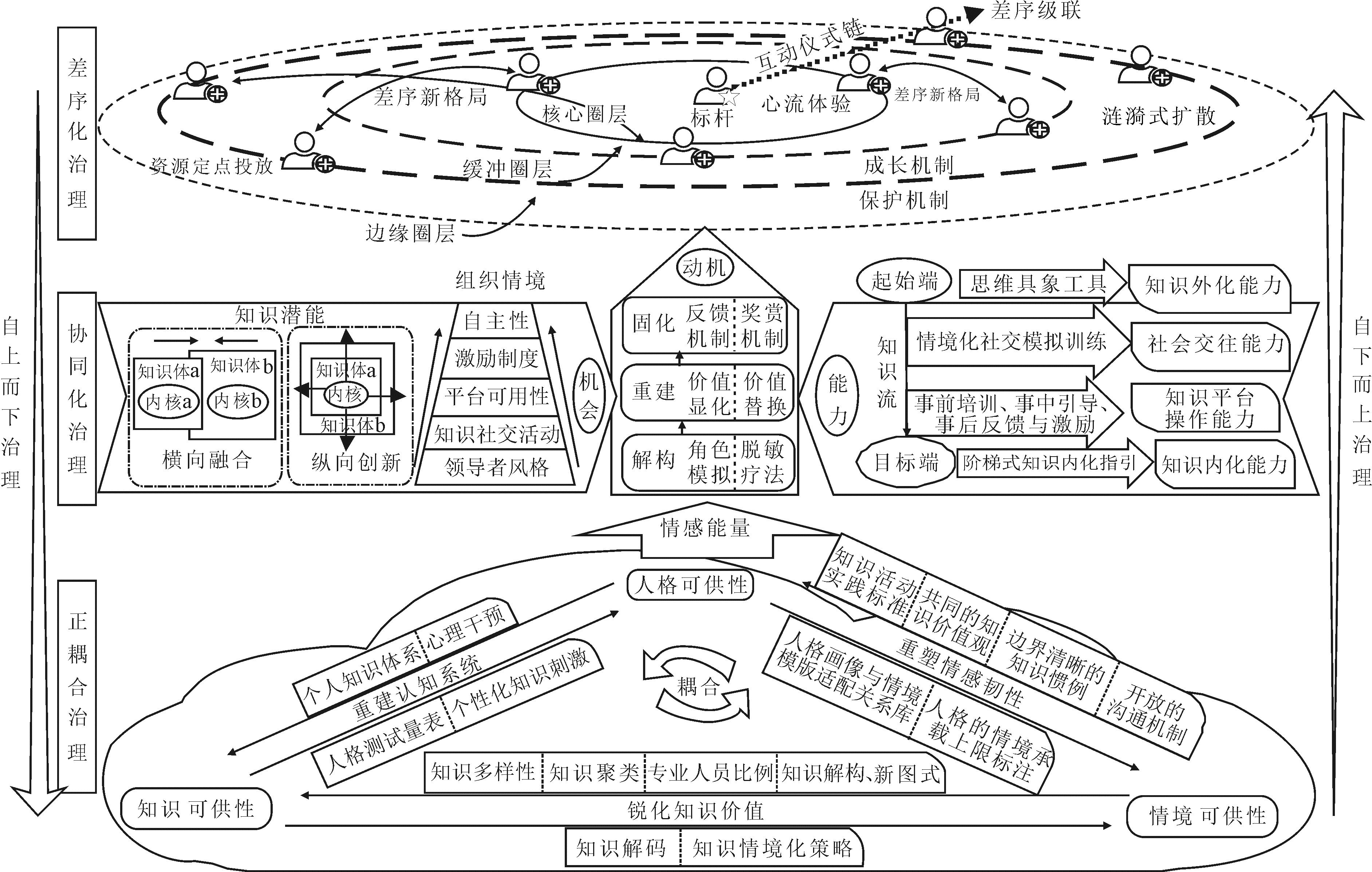 对于成员间初步外显的知识厌恶,按“感知层→驱动层→行为层”的治理逻辑,采取自下而上式治理,从萌芽期阻断知识厌恶发展进程。感知层是成员处理知识的初级接口,因此自下而上式治理主要包含三个方面。首先,从感知层着手,重构多维度的可供性适配秩序,通过探索正耦合治理实现人格、知识与情境可供性良性耦合的稳态化发展,推动积极情感能量扎根。其次,以多因素驱动力的动态平衡为重点,通过协同化治理实现成员能力、外部机会与参与动机正向协同的牵引式发展,驱动生产性知识行为萌芽。最后,以收缩组织中知识厌恶传染面为导向,通过差序化治理阻断知识厌恶在成员圈层内的无序传播,实现提升成员参与度与激活组织知识活性同步进阶目标,助推生产性知识行为正向传播,最大化组织知识活动价值。