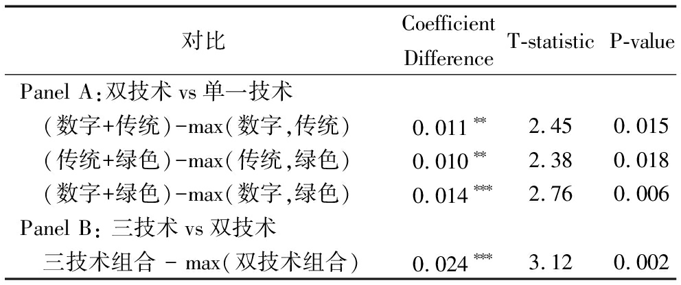 对比Coefficient DifferenceT-statisticP-valuePanel A:双技术vs单一技术 (数字+传统)-max(数字,传统)0.011∗∗2.450.015 (传统+绿色)-max(传统,绿色)0.010∗∗2.380.018 (数字+绿色)-max(数字,绿色)0.014∗∗∗2.760.006Panel B: 三技术vs双技术 三技术组合 - max(双技术组合)0.024∗∗∗3.120.002