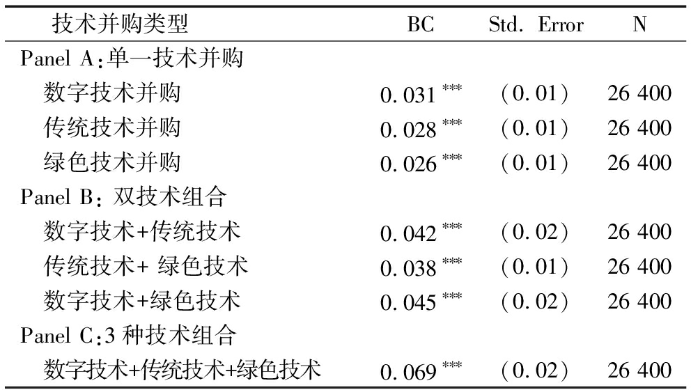 技术并购类型BCStd. ErrorNPanel A:单一技术并购 数字技术并购0.031∗∗∗(0.01)26 400 传统技术并购0.028∗∗∗(0.01)26 400 绿色技术并购0.026∗∗∗(0.01)26 400Panel B: 双技术组合 数字技术+传统技术0.042∗∗∗(0.02)26 400 传统技术+ 绿色技术0.038∗∗∗(0.01)26 400 数字技术+绿色技术0.045∗∗∗(0.02)26 400Panel C:3种技术组合 数字技术+传统技术+绿色技术0.069∗∗∗(0.02)26 400