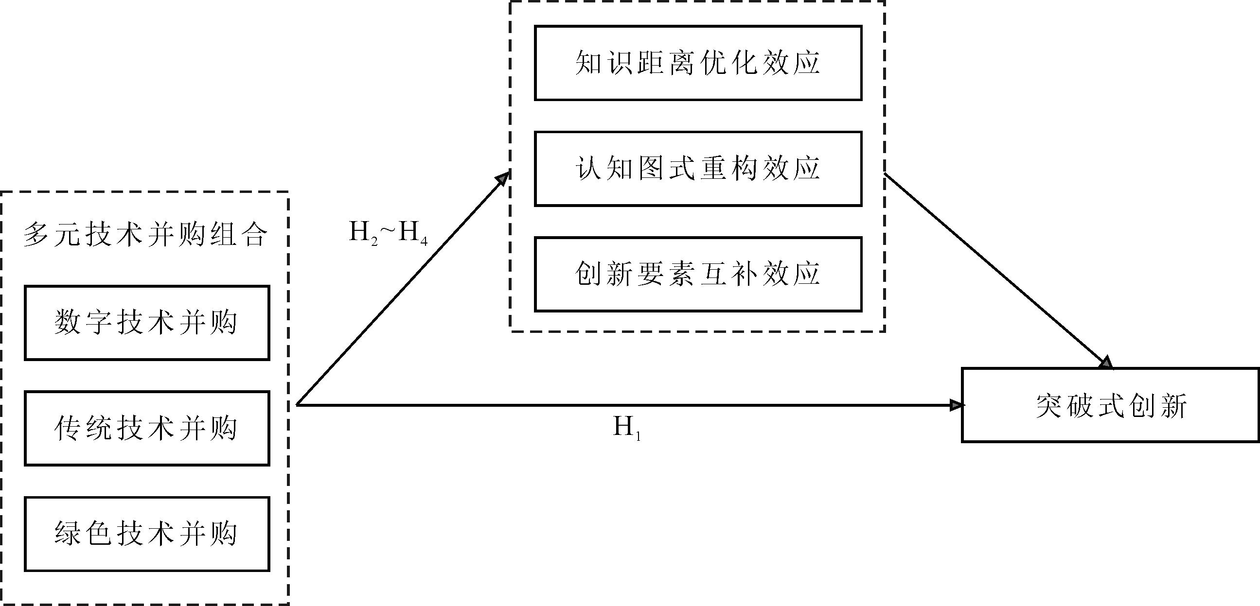 基于上述分析,多元技术并购组合通过知识距离优化、认知图式重构和创新要素互补3种机制促进突破式创新,据此构建理论框架如图1所示。