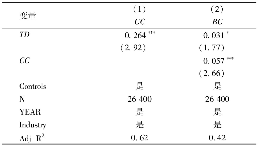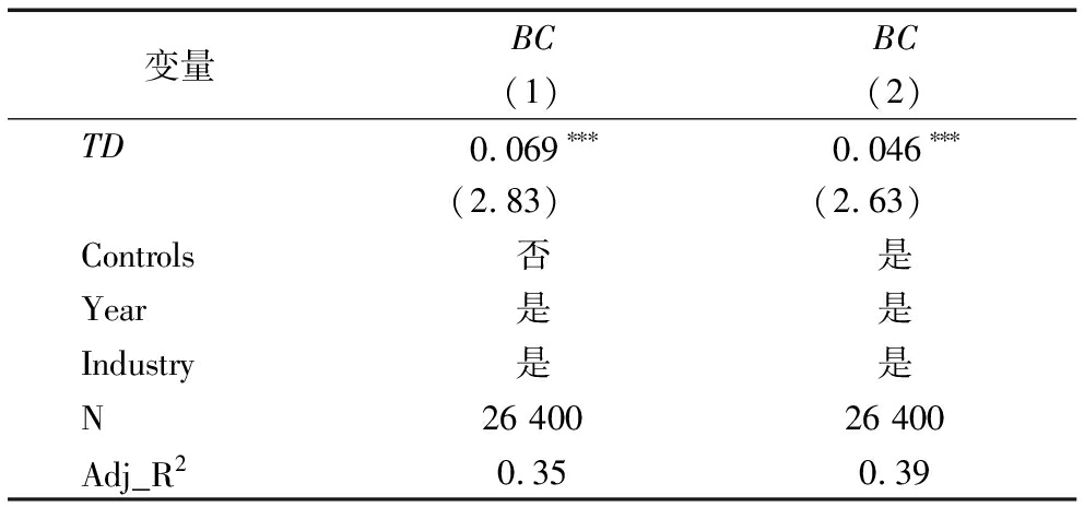 变量BCBC(1)(2)TD0.069∗∗∗0.046∗∗∗(2.83)(2.63)Controls否是Year是是Industry是是N26 40026 400Adj_R20.350.39