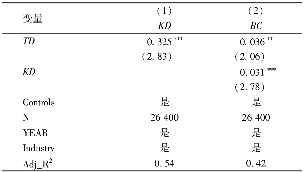 变量(1)(2)KDBCTD0.325∗∗∗0.036∗∗(2.83)(2.06)KD0.031∗∗∗(2.78)Controls是是N26 40026 400YEAR是是Industry是是Adj_R20.540.42