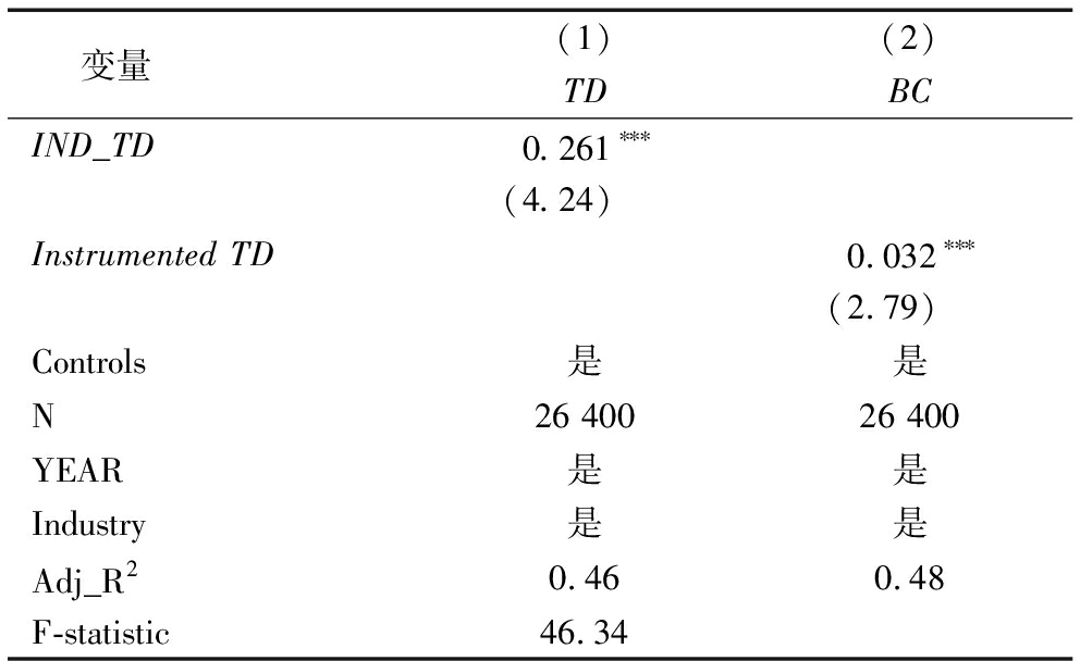 变量(1)(2)TDBCIND_TD0.261∗∗∗(4.24)Instrumented TD0.032∗∗∗(2.79)Controls是是N26 40026 400YEAR是是Industry是是Adj_R20.460.48F-statistic46.34