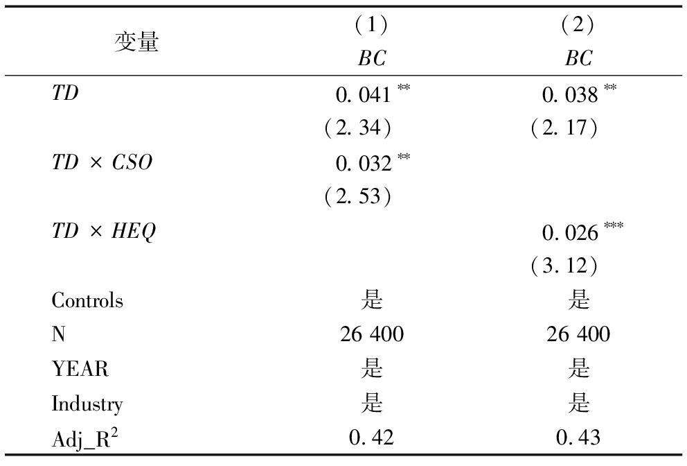 变量(1)(2)BCBCTD0.041∗∗0.038∗∗(2.34)(2.17)TD × CSO0.032∗∗(2.53)TD × HEQ0.026∗∗∗(3.12)Controls是是N26 40026 400YEAR是是Industry是是Adj_R20.420.43
