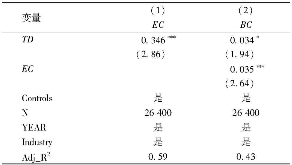 变量(1)(2)ECBCTD0.346∗∗∗0.034∗(2.86)(1.94)EC0.035∗∗∗(2.64)Controls是是N26 40026 400YEAR是是Industry是是Adj_R20.590.43